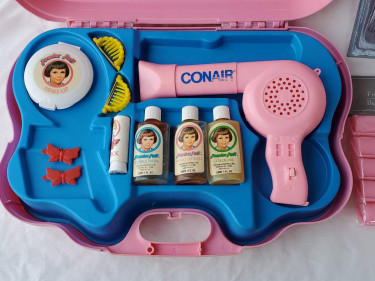 Vintage 1979 Conair Hair Dryer and Play Beauty Kit Toy Almost complete Has extras This is a very rare item and I cannot find another anywhere The Hair dryer really works with 2 AA batteries 4 barrettes, 2 yellow and 2 red with butterflies Comb Power Puff make up compact Lipstick Bubble bath, hand lot...