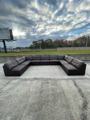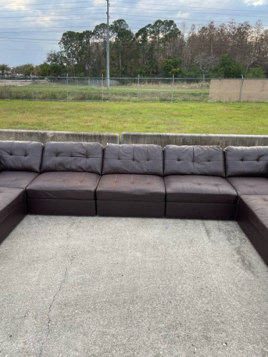 This is a big 10 piece modular sofa sectional that has been used but is in good condition. There is some peeling throughout on the lower cushions but no major rips or stains. The individual pieces are 36in x 40in x 34in with the corner pieces measuring 39.5in x 39.5in x 34in. The total length of the sofa as a...
