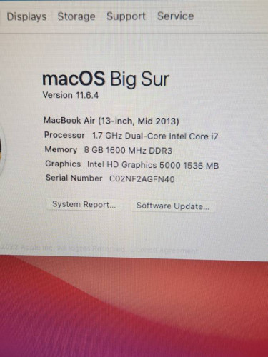 13 inch screen, YEAR 2013, core I-7 @ 1.7 Ghz , 8 GB DDR3 ram, 256 Gb SSD hard drive, Intel hd graphics 5000 1536 Mb, Big Sur MacOS, Camera, wifi. ------------------------------ $275 with 30 DAY WARRANTY ------------------------------ Venmo, cashApp, Zelle, CASH, CREDIT AND DEBIT CARD ACCEPTED (951)-5...