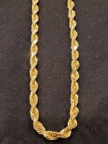 14K Yellow Gold THICK Rope Chain. SOLID! Lobster Clasp. Heirloom Quality, Strong Chain. Chain is Stamped 14K and has been acid tested to verify. Approximate Weight: 59.5 Grams! Approximate Chain Length (Bail to Clasp): 24 in. Appropriate Width: 5.5 mm Condition: Excellent-Like New Pre-owned, th...