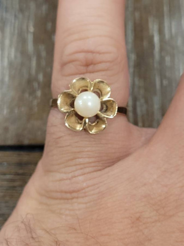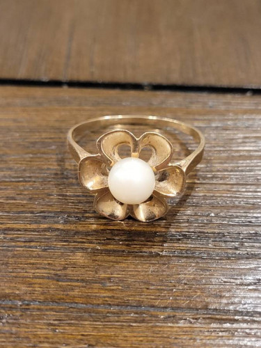 Beautiful Vintage 14K Yellow Gold Ring. Stamped 14K and acid test Verified. Could use a good cleaning, but otherwise Excellent Condition. Size 8.75-9. Includes what I believe to be a decent sized pearl (although we do not have the equipment to test colored stones) that forms the center of a pretty flower desi...