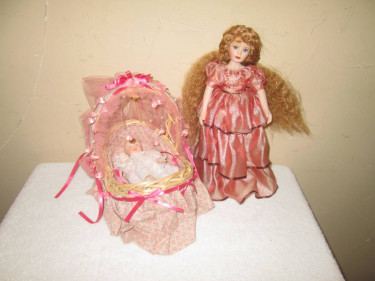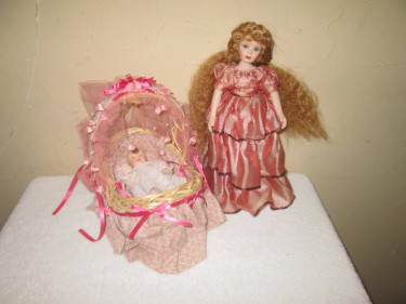 $15 for All Lot Dolls Porcelain Doll and Baby in a wicker Moses basket bed, Doll 10.5" H see detail for Toys or Collection Doll don't know the brand Doll long hair, Ruffle Gown, blue eyes, is wearing wig wicker basket: 8"H 7.5" long 6" wide all the decoration, fabric around and mattress is glued...