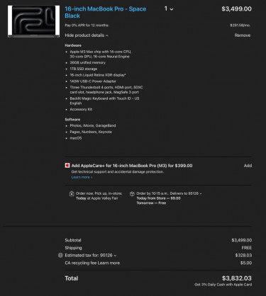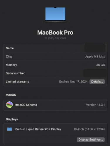 Apple Macbook Pro M3 Max chip with 14‑core CPU 30‑core GPU 16‑core Neural Engine 36GB unified memory 1TB SSD storage 16-inch Liquid Retina XDR display Like new Still under warranty until Nov 2024 No cracks, scratches, scuffs ...etc 10 Battery Cycles Comes in original box with all accessories. ...