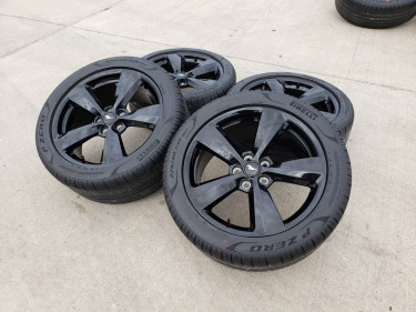 19" Ford Mustang Nite Pony / Stealth Package OEM Black wheels and tires -Tires are 255/40/19 front, and 275/40/19 Pirelli P Zero, BRAND NEW! -These wheels and tires will make your Mustang look amazing! -Wheels are 19x.8 -We have a large selection of the 2016-2023 Mustang wheels: 17s, 18s, 19s, and 20s i...