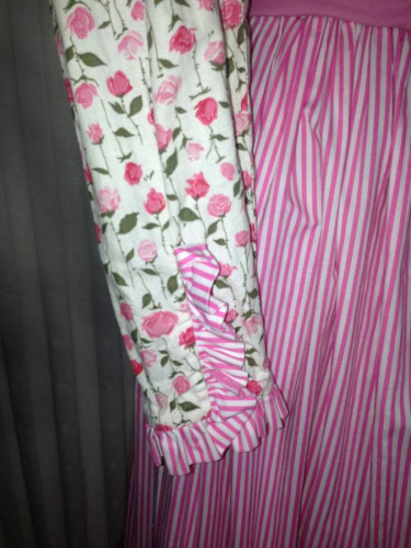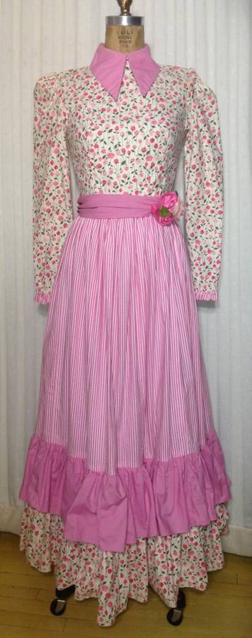 60s NETTIE VOGUES Maxi Granny/Hippie/Prairie/Couture Cotton Dress 32-24-36 Sash Corsage Label: "A NETTIE VOGUES MODEL" Granny-Maxi-Hippie-Party-Couture-Prairie-Dress Made in England for Bloomingdale's Tag: 100% Cotton CONSTRUCTION: floral calico, solid pink, & pink striped fabrics in perfect comb...