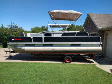 1996 20 ft Fish and cruise pontoon boat with older 80 HP Mercury outboard engine. Good floor and carpet. Seats are in fair condition. New fencing panels, almost new steering wheel and cable, almost new control box and cables. Boat has a bimini top and a new stainless steel telescoping ladder on the front....