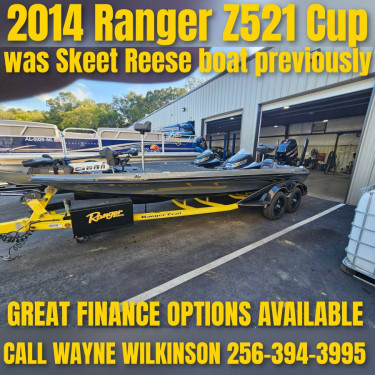 2014 Ranger Z521 cup, mercury 250 xp 1000, dual power poles, 36 volt ultrex, 12" lowrance on dash, 4 bank charger, hydraulic jack plate, hot foot, new crank battery, custom paint skim and custom paint trailer with custom wheels and storage boxes. Previously Skeet Reese boat. 550 HRS **IN STOCK!!!** **...
