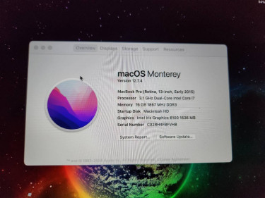 Very clean early 2015 retina 13.3 Apple Macbook Pro for sale. This model has the 3.1ghz i7 with 16gb of ram and 500gb SSD running MacOS monterey. Battery only has 240 cycles and is working great. Magsafe 2 Charger included but it was frayed a bit so has been taped.