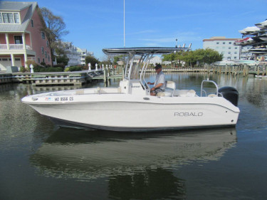 2018 Robalo R200 powered by a Yamaha F150XB with 383 hours. White hull with Ocean Sand upholstery. Optional equipment on board includes anodized aluminum t-top, console cover, leaning post cover, Garmin 742XS, tilt steering, steering wheel with control knob, porta pottie, removable forward facing bow backre...