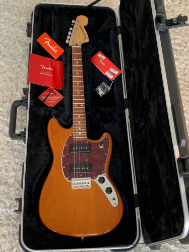 Super clean 2021 Fender Mustang guitar with Aged Natural Alder body, tortoise pickguard and great sounding MP-90 pickups. Very comfortable player with small body and 24” scale. Headstock back includes Fender 75th anniversary logo. Guitar in MINT condition and only shows typical light pickguard scratches. I pu...