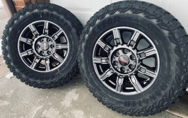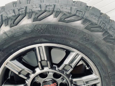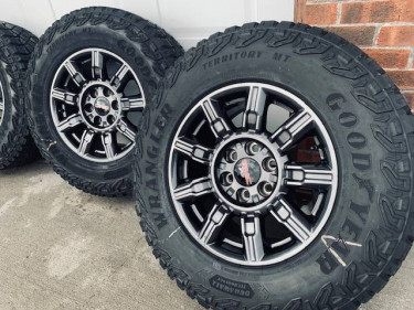 I have a set of new Gunmetal Grey 18" factory takeoffs from a 2024 GMC Sierra 1500 AT4. They come with load range C, 6 ply Goodyear Wrangler Territory MT’s size 275/70/18. They are complete with sensors and lugs. The sensors will work for years 2019 and newer, 2018 and older will require the sensors to be cha...