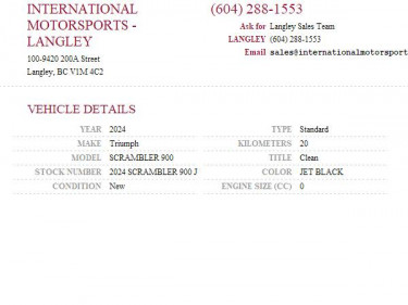 International Motorsports - Langley Ask for: Langley Sales Team ☎ (604) 288-1553 100-9420 200A Street Langley, BC V1M 4C2 Enter this link to see more images plus all other inventory we have available: http://lyv.cc/UG3F4 2024 Triumph SCRAMBLER 900 Price: $13,095.00 Basic ...
