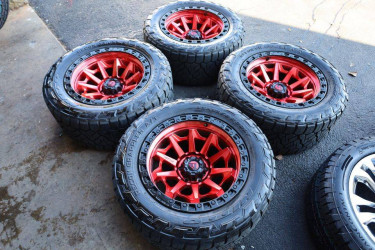 Selling a set of 4 - 20x10 Fuel Red/Black bead ring with -18 offset mounted on Nitto Recon Grappler AT's Fuel Off-Road D. Covert Wheel Candy Red Black Bead Ring 20x10 -18 20x10s 33x12.5x20's Nitto Recon Grappler AT's matching set of tires with approx 70-80% tread remaining 6x135 - Will fit F...