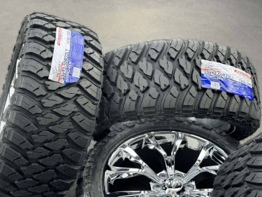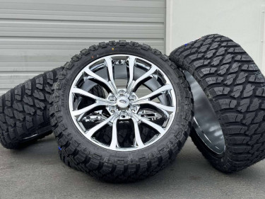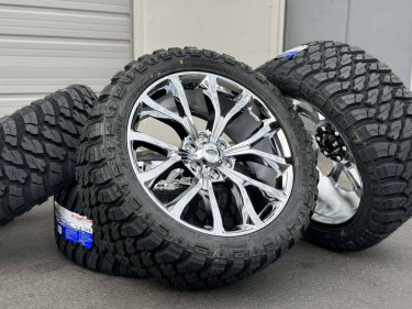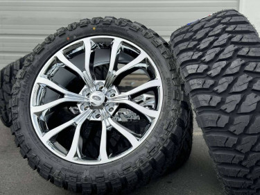 22x9.5 real chrome coated OE style Ford F150 / Expedition Limited style rims which are 22 inch diameter and 6 lug 6x135 mm which will fit 2004 until newest 2024 Ford truck Rims are very nice and quality aftermarket set of 4 brand new with limited warranty Tires are 33” mud terrain pretty aggressive 33x...