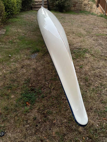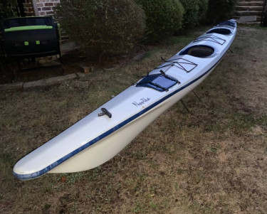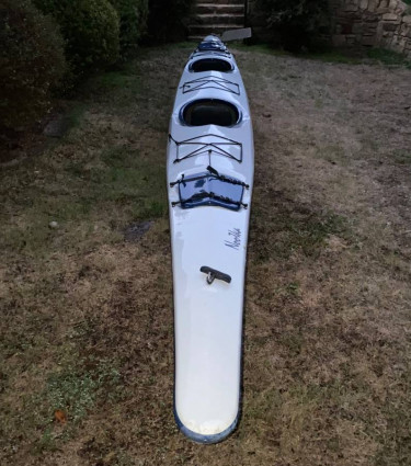 Necky Nootka tandem kayak, Fiberglass and Kevlar. Hull is in very good condition, no glass damage or repair history, compartment bulkhead dividers all sound. Original blue-gray deck finish is in very good shape with hatches and cockpit coamings in dark blue. Bottom-sides in the original white with typical ...