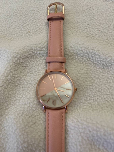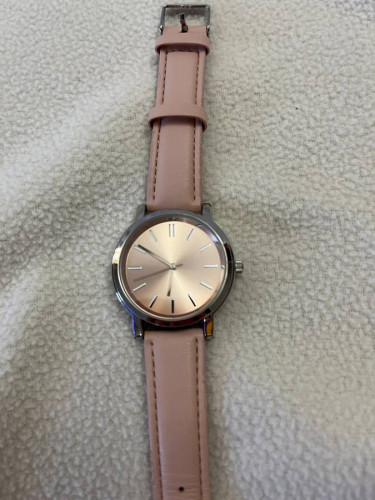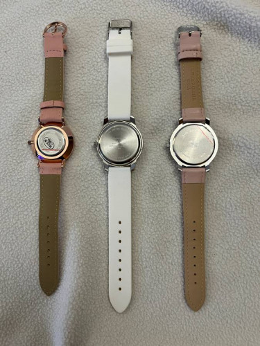 3 women's watches All previously worn Need new batteries White - Edge of white face is chipped. Can see silver edging. Pink with split color face - no issues Pink face - top edge of face scratched