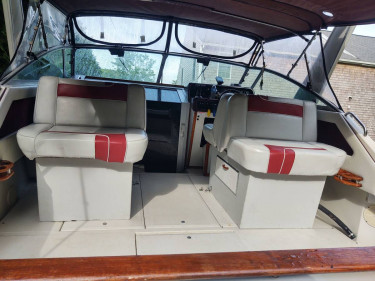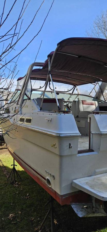 30' SeaRay Cabin Cruiser - 2 rebuilt v8 motors (heads, exhaust mani's, risers, carbs, water pumps, hoses and more) 0 hours since rebuild, straight shaft inboards (no I/O's or V Drives to deal with) that make her super ez to maintain and maneuver, raised Bimini top with full camper canvas, large one level dec...