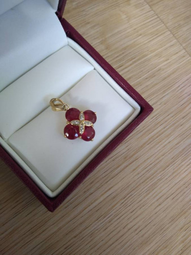 New large pendant features 3CTW round-cut natural ruby and 0.1CTW white diamond accents in 10K yellow gold. Pendant measures 1"L x 3/4"W x 1/4"H.