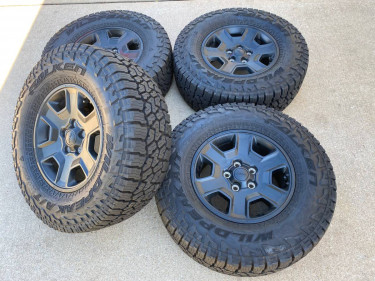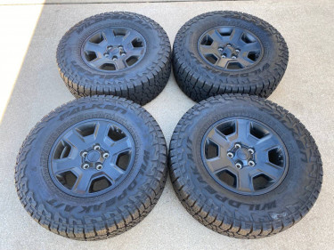 For sale only as a full set Take offs 2023 Jeep Gladiator Mojave wheels and tires like new 18/32 of tread left on, TPMS sensors included. Nothing is wrong with them. 285/70R17 Falken Wildpeak AT 100% of tread left on. Price to sale $1200 cash or Zelle. Hablo español. 832_880_4400 They fit per...