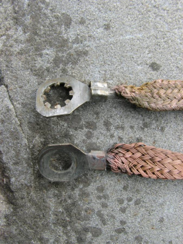 Here are 2 factory original Chevrolet engine ground straps. These 2 came off a 59 Chevrolet. They are 9 3/4 " long and are originally bolted to the valve cover and the firewall on all V8 engines. The hole side goes to the firewall and the open-eye side slips under the valve cover bolt. Click on [more ads by ...