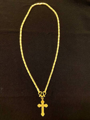 - 6 baht double diamond cut bar link chain with 1 baht cross - weight: 106.12 g - Length: 25 inches - This chain was custom-made in Thailand. It was made with high-quality workmanship and superb finishing. Chain and cross must be sold together. Perfect gift for someone looking for a beautiful chain and/o...