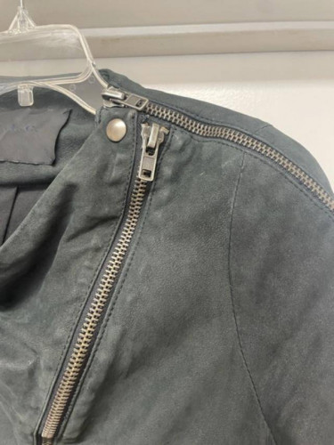 Very cool Nubuck leather jacket from A.L.C. Its marked a size 6 but fits more like an XS / Small.. and the sleeves fit snug. I think it can be worn as a top too. The leather has some marks on it throughout - see the last 2 photos of lower front and sleeve. The color is a washed black. Asymmetric zip front w...