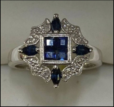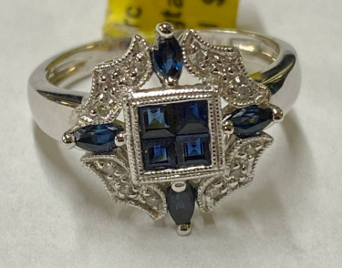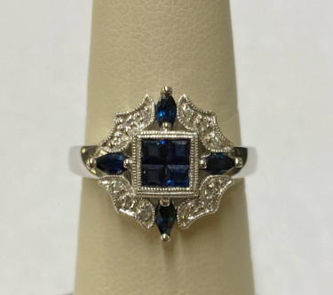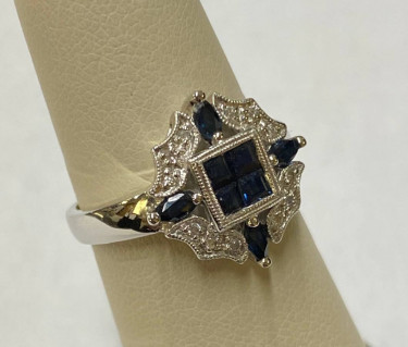 Amazing White Gold Sapphire Fashion Ring Main Stone: Sapphire The Center Sapphires are Princess Cut The Ring also has Four Marquise Cut Sapphires on Each Corner In Addition there are Bead Set Round Brilliant Cut Diamonds surrounding the Stunning Sapphires The Diamonds are G color and SI1 clarity weighing...