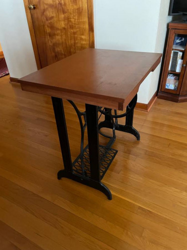 Up for sale is a wrought iron singer sewing machine treadle base with a wood top. Makes a great small desk or side table. It measures 29 inches wide, 22.5 inches deep and stands 29 inches tall. It comes from a smoke and pet free home. Any questions, just ask.