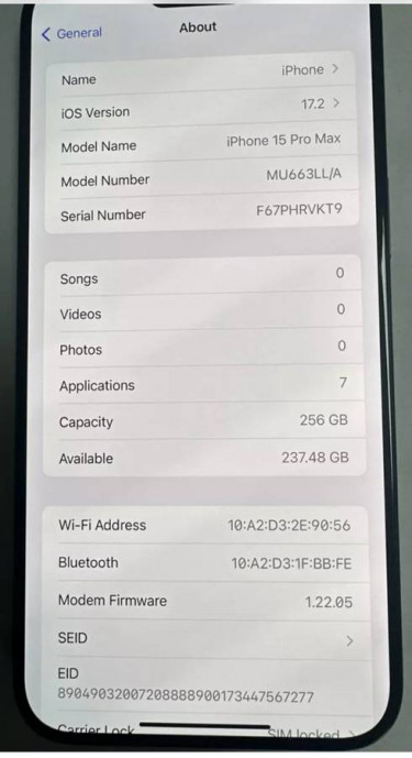 Apple iPhone 15 Pro Max - MU663LL/A 256GB - Sim Locked Verizon For sale we have an Apple iPhone 15 Pro Max - MU663LL/A 256GB - Sim Locked Verizon. This iPhone is used and fully tested to be functional. We have tested the iPhone to Power on, Hold Full Charge, Sound, Wifi, Bluetooth, and all ports to be ...