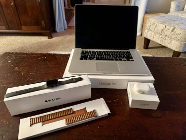 Everything is in great to excellent condition. * Apple 15-inch MacBook Pro (retina, mid-2015, 16GB RAM, 256GB Drive) * Apple Watch 6 44mm Titanium (cellular, extra leather band size L) * Apple AirPods Pro (1st gen., all tips included)