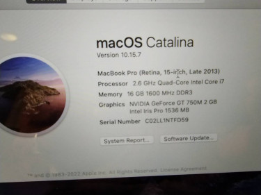 APPLE MACBOOK PRO RETINA A1398 15" Intel i7 Quad -Core Dual GPU (NVIDIA and INTEL Iris pro) 16GB RAM 512GB SSD Mac OS Catalina. Item is in very good condition with no scratch on LCD, Keyboard are. Battery charges like new. Comes with Original Apple Mag Safe Charger. . We can meet at any a public place for de...