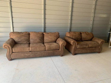 In good condition they do have plenty of cushion left no rips just minor signs of wear as you can see in the pictures. The seat covers are removed for easy cleaning, brown color and suede material see pictures for more details.. (Free Delivery If Needed ) Measurements 3 seater sofa Length 7ft 3" He...