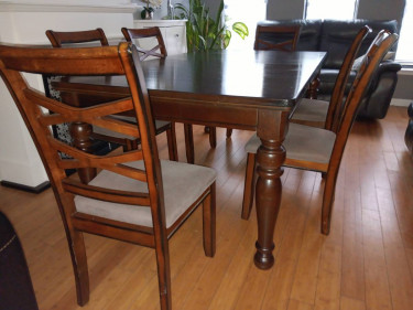 Beautiful ASHLEY FURNITURE Real Solid Mahogany Wood Dinning Table with 6 Real Solid Mahogany Wood Chairs, does have an extension leaf and also the table legs could be easily removed for easier transportation. Everything is in excellent condition and completely clean, non smoker home, no stains and no rips or ...
