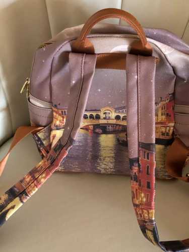 BACKPACK HAS PICTURES OF VENICE ITALY HAD BEEN PURCHASED IN VENICE ITALY 2 SIDE OPEN POCKETS, TOP HANDLE , ADJUSTABLE SHOULDER STRAP, EXTENDED FRONT POCKET CLOSED WITH ZIPPER. HAS NOT BEEN USED
