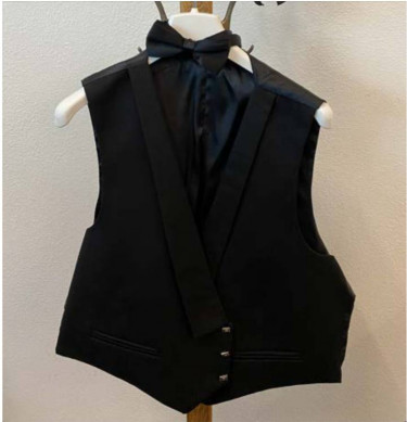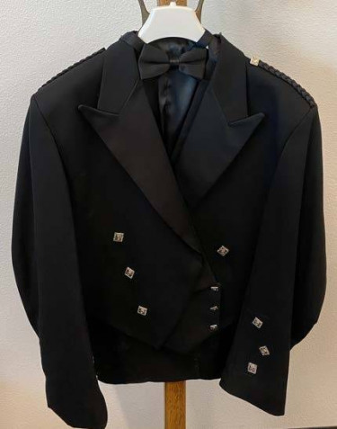 Bagpiper's outfit. Includes the following: St. Kilda Kilts Black Prince Charlie Jacket and waistcoat size 48L Bow Tie 8 Yard Kilt in Blackwatch plaid Matching Tartan Flashes Irish Kilt Pin Dress travel bag with zippered pockets on side for shoes/accessories L&M Highland Outfitters - Badger/Celtic...