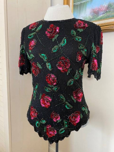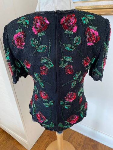 Laurence Kazar Beaded and Sequin RoseTop on Black silk zippered top from the 1990's Excellent condition, non smoking home never worn, purchased at a vintage clothing shop, label says size large but when I remeasured, the measurements were more like a S to Med size. 34-36 Bust, 30 Waist, 34 Hip Great top for...