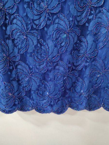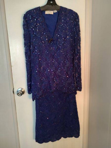 2 Piece "Real Beads" Cocktail Top and Skirt. Top-V Neck- Long Sleeve (not lined) Scalloped Bottom-Bias is lined Skirt fully beaded with Real Beads-Calf length-Scalloped Bottom-Lined Size 12 made in India-needs new rubber band for waist.