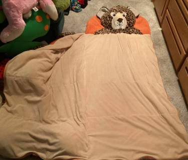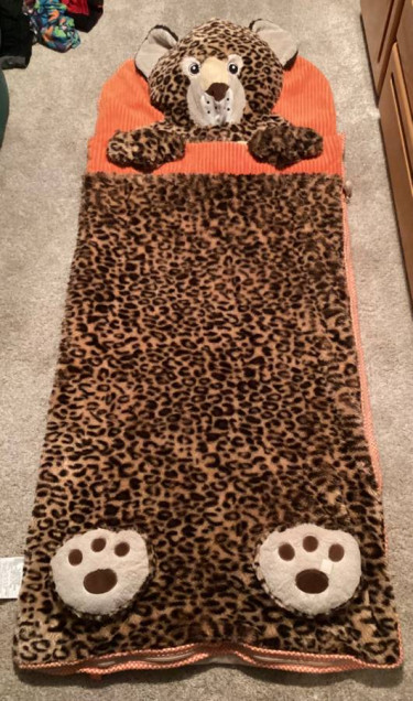 Please provide a name and contact number in your initial response. Bear Sleeping bag/Blanket Measurements: 65 in. (Full length including head pillow) 27 in. (Wide) Unzips to lay out flat as a blanket. Has 4 Velcro straps for securing during storage and transport. Washed and ready to go! In very...