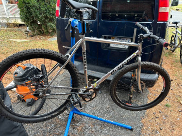 This is the classic Blanchi S.A.S.S. (Shiny Ass Single Speed). Frame size 21.5” with 26” wheels. The frame and fork are Dedacci Cro-Mo that is chromed for that extra shine! Recently rebuilt with many new parts. The spec: - 21.5” Bianch SASS frame and fork. - New Race Face Handlebar. - New WTB Headset. -...