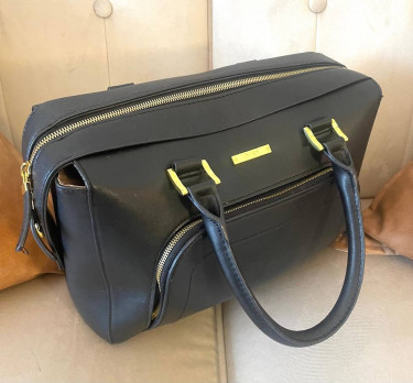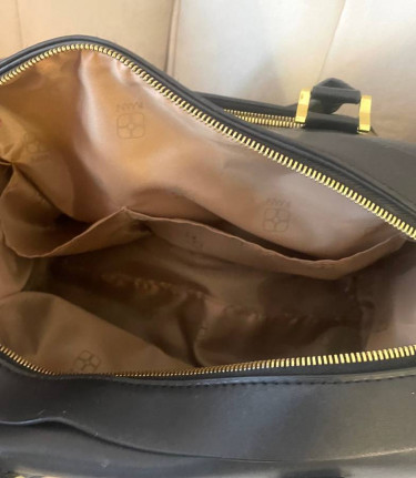 I am selling a beautiful Black "Faux Leather" Purse by "Iman Handbags" - Like NEW! ~Shell: 100% Polyurethane, Lining: 100% Polyurethane. ~ Bag has black carrying straps and measures: 14" Left to right, x 8" front to back, x 9" top to bottom. Has 4 gold buttons on bottom - that sits straight up....