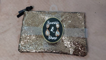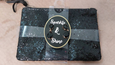 Get this blinged clutch with gold and black zipper, black tassel and matching earrings. Purse measures 8 inches wide and 5 inches tall. The matching EARRINGS ARE FOR PIERCED EARS and dangles about 1.5 inches long. $5 per clutch purse. *Black glitter sequins with black/gold teardrop earrings (2 bags tota...