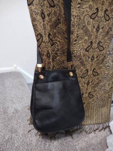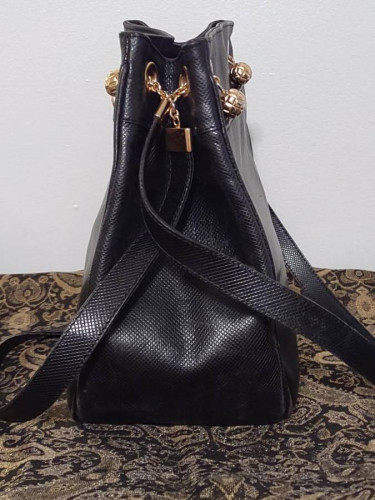 Early Bottega Veneta bag. It has been referred to as a bucket bag and also as a Marco Polo. Soft, textured leather. Double handles with sections of chain that connect to gold tone textured balls through grommets. A really nice touch. Snap closure pocket on front. Shiny, gold-tone hardware. Nearly new co...