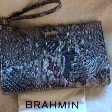 Brahmin Daisy Clutch Wristlet color Icy Python Melbourne Size- 8.5 x 5.5 Introducing the Brahmin Daisy Clutch Wristlet in the enchanting Icy Python Melbourne color, sized at 8.5 x 5.5 inches. Crafted from genuine leather, this lovely accessory features a top zippered closure, inside-zippered pocket, and ...