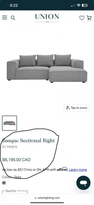 Brand New Moe’s furniture ‘Basque’ Modern light grey fabric apartment size sectional sofa chaise. 2 piece modular sectional / chaise. Comes apart in 2 pieces that will fit into very small condo spaces easily, right hand facing chaise. This sofa was used for staging purposes only. Absolutely No wear, tears...