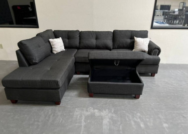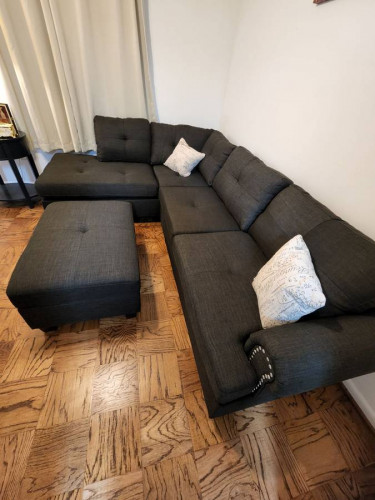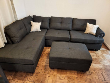 Brand new Ash black Charcoal color Linen Sectional Sofa with storage ottoman and 2 accent pillows. Comes new in 3 boxes. Assembly required. Includes hardware, instructions and the tool needed. Reversible chaise can be used on either side. 107x75x34h or 75x107x34h. Wood legs. Delivery 🚚 for additional ...