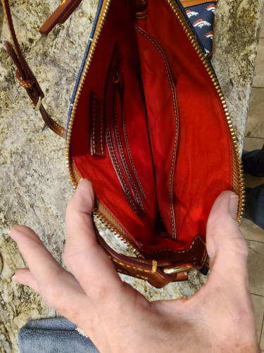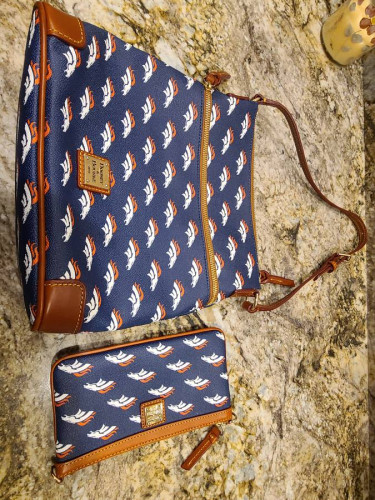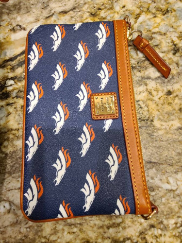 Brand new - Denver Broncos handbag and matching wristlet. Retail ~$250. Pebble leather body, adjustable crossbody strap, top zip closure, front zip pocket, metal logo plate. Lined interior, two front-wall slip pockets, back-wall slip pocket, back-wall zip pocket, key keeper. Measures approximately 10-1/4"...