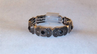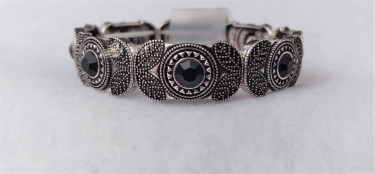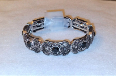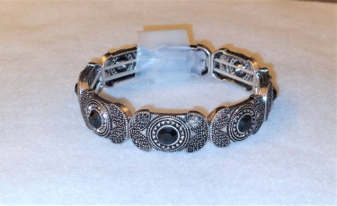 Brand New Embellished Black & Silver Leaf Design Stretch Bracelet This segmented silver plated acrylic stretch bracelet has a kind of southwest design with leaves and black center stones on each segment. It has two rows of elastic on the inside of the bracelet that keep it tight on a large wrist or for s...