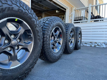 Set of 4 Fit any year 5 on 5 Jeep Removed at dealership. Rims are in perfect condition no issues. Falcon Wildpeak AT3 Lt 285/70/17 still have nipples and paint strips. Gunmetal grey No emails No voicemails Prefer text Fivexxxxxxonezzzzzeight Fiveeighteight Sevenfiveonesix Rubicon whe...