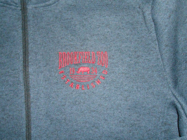 Brookfield Zoo, Brookfield IL, full zip hooded jacket, blue gray in color with red stitching and red embroidered "Brookfield Zoo Established 1934" on left chest, size XL, in excellent condition with no rips, tears or stains. The jacket is 100% polyester, has 2 zip pockets and thumb hole on sleeves to cover ha...