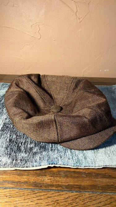 It is in new condition. The little round shaped thing on the top of the hat makes a little rattling noise if you shake it. It could be called a newsboy cap, flat cap, gatsby cap, eight-panel cap, etc.